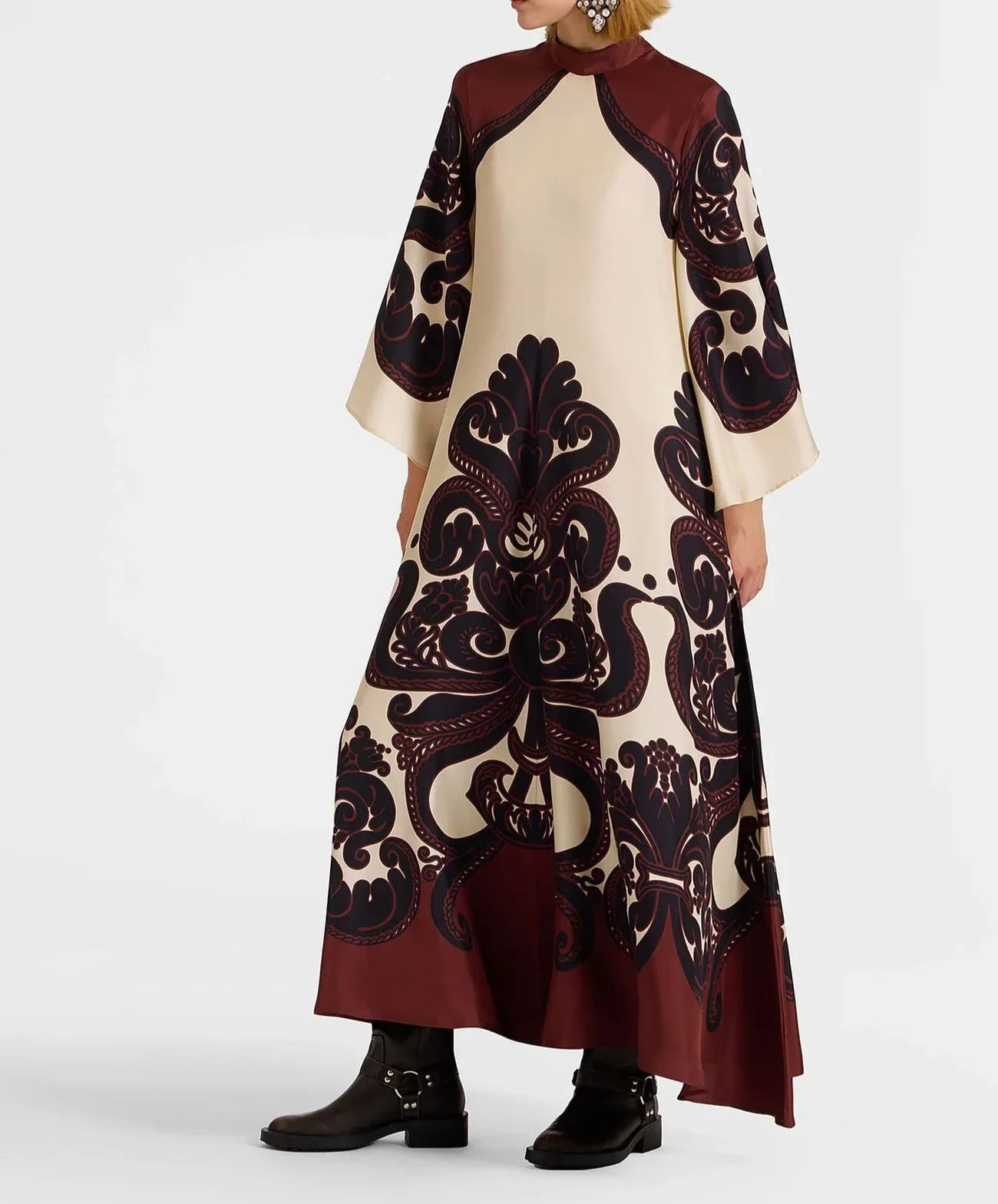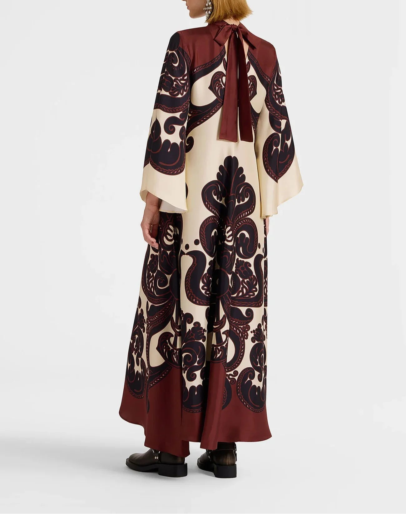 Questo abito in satin presenta una sorprendente stampa Grenadilla, un elegante collo alto e maniche a cascata fluide. Il fiocco sul retro e la lunghezza maxi aggiungono un’eleganza senza tempo, rendendolo perfetto per le occasioni speciali.